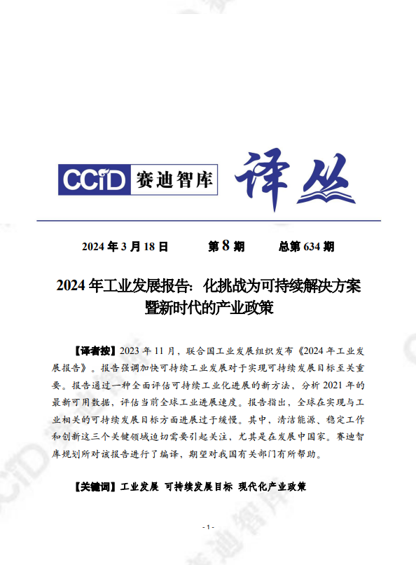 2023年11月,联合国工业发展组织发布《2024年工业发展报告》。报告强调加快可持续工业发展对于实现可持续发展目标至关重要。报告通过一种全面评估可持续工业化进展的新方法,分析2021年的最新可用数据,评估当前全球工业进展速度。报告指出,全球在实现与工业相关的可持续发展目标方面进展过于缓慢。其中,清洁能源、稳定工作和创新这三个关键领域迫切需要引起关注,尤其是在发展中国家。赛迪智库规划所对该报告进行了编译,期望对我国有关部门有所帮助。