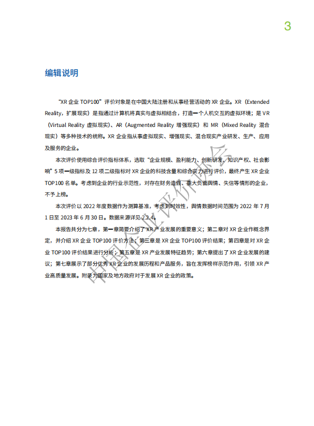 “XR企业TOP100”评价由中关村数智人工智能产业联盟和中国企业评价协会共同发起,旨在树立XR企业高质量发展的标杆。评价工作根据行业和企业实际,将XR企业分为硬件设备制造、基础软件开发、技术行业应用、内容制作及衍生服务四类,选取“企业规模、盈利能力、创新研发、知识产权、社会影响”5项一级指标及12项二级指标对XR企业的科技含量和综合实力进行评价,产生XR企业TOP100榜单,并通过对上榜企业进行分析,形成《2023中国XR企业TOP100发展报告》。