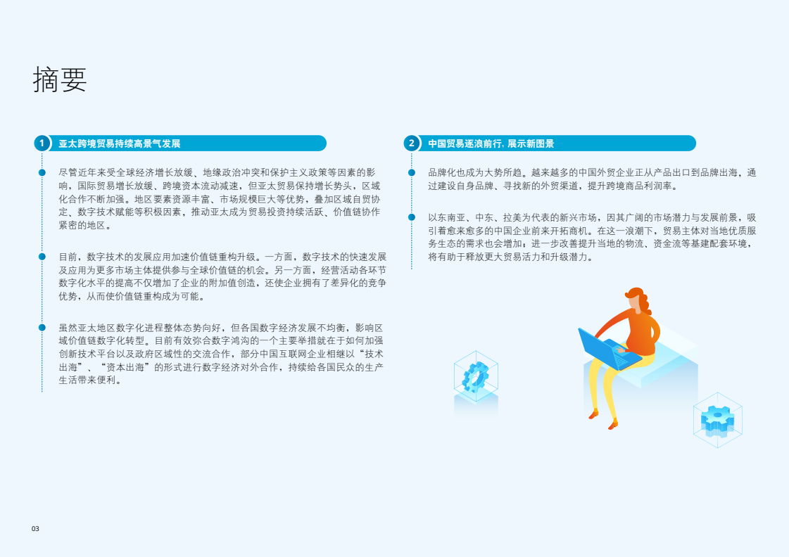 报告同时关注这一趋势下的广大跨境中小微企业——成长中的亚洲微型跨国企业。德勤中国科技、传媒和电信行业主管合伙人程中表示:“数字贸易企业正借助大数据分析、人工智能、物联网和云计算等先进的数字技术,构建全新的商业模式和价值链,为全球消费者提供更加丰富多样的商品和服务。以跨境电商为代表的数字平台正打破空间和时间的束缚,促进全球价值链的紧密协作。而广大的中小企业正借助平台企业及其国际化服务生态和数字化技术经历关键一跃,成为各个领域的‘跨境小巨人’。”