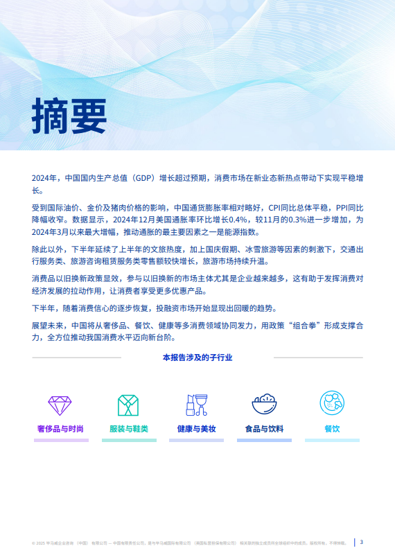 2025年2月,毕马威中国发布《2024年下半年消费品零售行业分析》报告。本报告基于毕马威团队完善的知识体系与丰富的项目实践经验,对宏观经济到微观市场主体进行了全面分析,围绕奢侈品、服装、美妆、食品餐饮等细分领域,深度剖析消费品零售行业趋势、投资交易及税务快讯,以期帮助行业参与者定位下半年的行业发展方向,实现最大程度挖掘增长潜力。