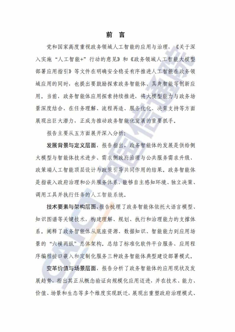 报告对政务智能体的发展应用开展了全景式分析,力求为政务部门、技术开发者以及相关研究人员提供启发与借鉴。报告重点围绕政务智能体的发展背景与定义、技术要素与架构、变革价值与场景、面临挑战及未来发展建议五大方面展开研究。