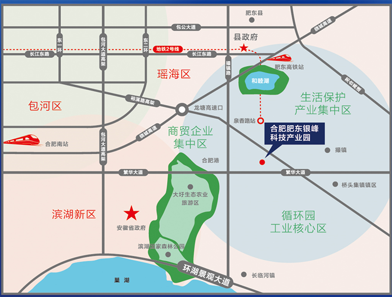 肥东银峰科技产业园所处区域通过撮镇无缝融入肥东县城、和睦湖新城板块,已形成10分钟都市圈。区域拥有地铁2号线延长线,长江东路、包公大道、合裕路、临泉东路、新安江路、瑶岗路、繁华大道、环巢湖大道等8条主干道贯穿,且拥有多路公交车。