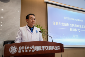 院长傅先明教授为中心揭牌致辞,他强调在华安成立安徽省首个重症(HDU)康复医学中心,揭开了安徽省重症康复发展的序幕,对于重症患者的临床康复工作具有里程碑的意义。全国有很多脑出血、重度颅脑损伤等多种原因导致的重症患者,他们康复周期长,对康复设备、技术要求高,而重症(HDU)康复医学中心配备专业的设备和各学科专家组成的重症康复治疗团队,可以实现患者从ICU到HDU再到普通病房的平稳过渡,缩短患者住院周期,降低治疗成本,最大程度地帮助患者改善功能状态,提高生活质量,这也是华安脑科医院践行“恩报华夏,福佑安徽”的办院初心的体现。