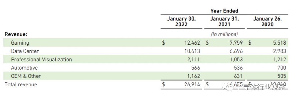 受益于对安培架构产品的强劲需求,英伟达游戏营收同比增长61%,至125亿美元,这反映了GeForce GPU取得了更高的销售额;数据中心收入同比增长58%,达到106亿美元,用于云计算和人工智能工作的训练和推理的GPU。