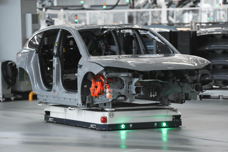 这是在安徽省合肥市新桥智能电动汽车产业园蔚来第二工厂拍摄的新能源汽车生产线